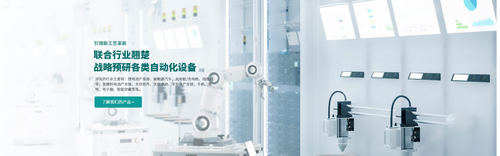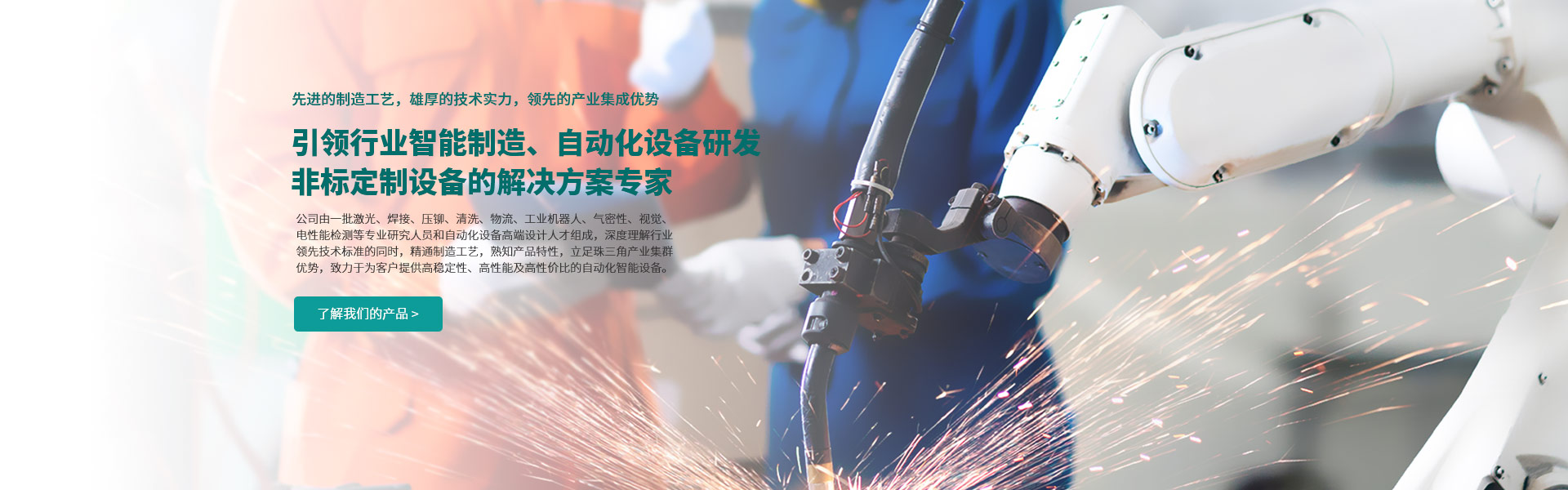 公司团队核心成员由激光、焊接、压铆、清洗、物流、工业机器人、气密性、视觉、电性能检测等专业研究人员和自动化设备高端设计人才组成,平均从业经验十五年以上,深度理解行业领先技术标准的同时,精通制造工艺,熟知产品特性,立足珠三角产业集群优势,致力于为客户提供高稳定性、高性能及高性价比的自动化智能设备。